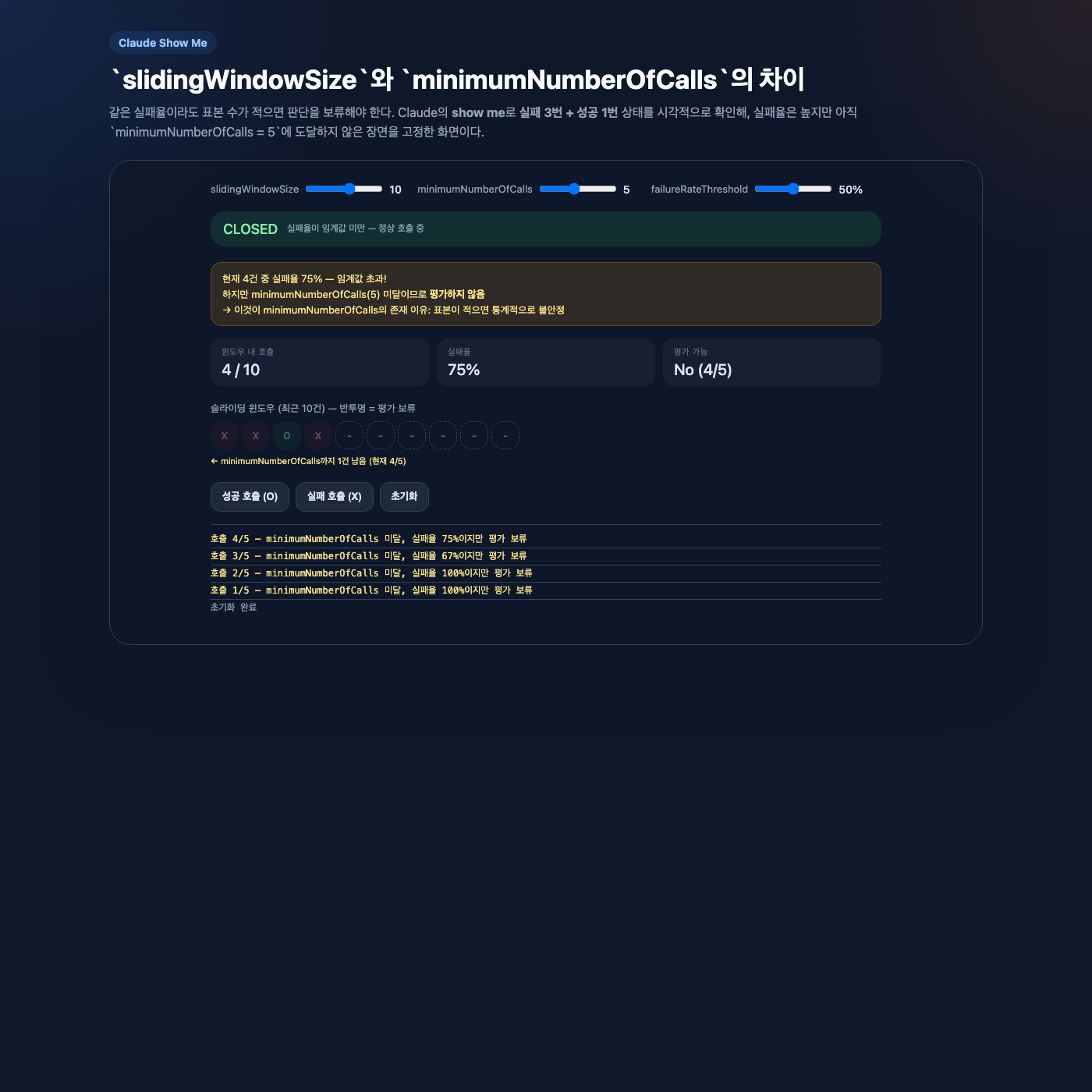 원인은 실패율과 표본 수를 같은 문제로 생각한 데 있었다. 실패율은 비율이고, 'minimumNumberOfCalls'는 그 비율을 판단해도 되는 최소 표본 수다. 둘은 함께 움직이지만, 역할 자체는 달랐다.