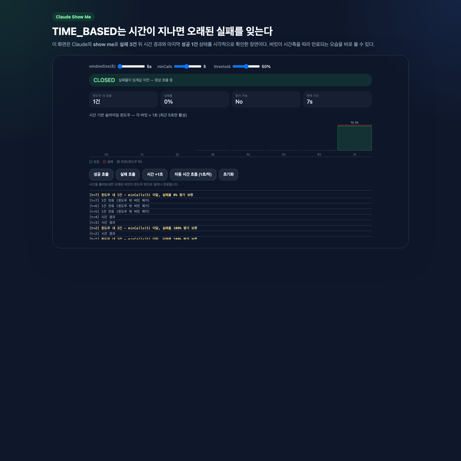 아래 화면도 Claude의 'show me'로 시각적으로 확인한 캡처다. 실패 3건을 만든 뒤 시간을 흘려보내고 마지막에 성공 1건을 넣으면, 오래된 실패 버킷이 window 밖으로 밀려나면서 현재 window 안에는 최신 호출만 남는다.