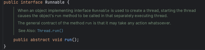 - Runnable 인터페이스는 run()만 구현되어 있다