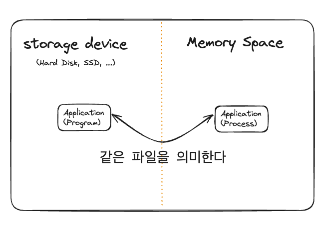 프로그램(Program)과 프로세스(Process)는 둘 다 어떠한 목적을 위해 처리 방법과 순서를 기술한 코드의 집합체를 말하는데, 다만 프로그램은 저장 장치에 저장된 '정적'인 상태를 말하고, 프로세스는 실행을 위해 메모리 공간에 올라와있는 '동적'인 상태를 의미한다.